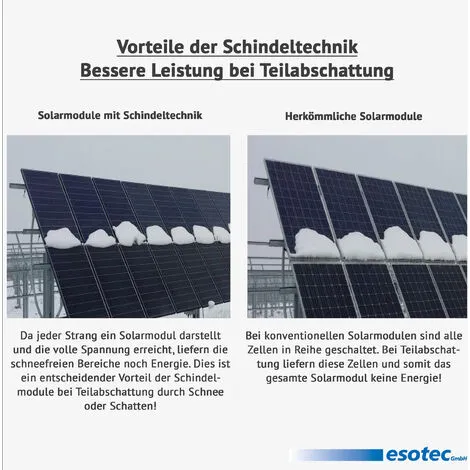 Le point culminant est le module solaire de haute qualité avec la technologie innovante des bardeaux. Dans ces modules, les cellules solaires individuelles sont posées les unes sur les autres comme des tuiles de toit et formées en plusieurs chaînes. Cela permet des dimensions particulièrement petites avec des performances élevées et des propriétés particulièrement excellentes dans le cas dun ombrage partiel partiel par les nuages ou la neige. Les modules solaires ont des cellules solaires monocristallines avec un rendement minimum de 18 %. Les modules solaires ont un cadre en aluminium circonférentiel dune hauteur de 35 mm pour le montage. Le raccordement électrique se fait via des câbles avec fiche et prise MC4.