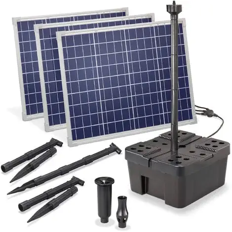 Le kit prêt à raccorder comprend une pompe darrosage et des accessoires, trois modules solaires puissants de 50 Wc avec piquets de terre et un grand boîtier de filtre comprenant des tapis filtrants. Deux sacs en filet sont également fournis, que vous pouvez remplir avec votre propre média filtrant (comme «média filtrant bio», Art. 101077 également disponible dans la boutique en ligne solarversand).